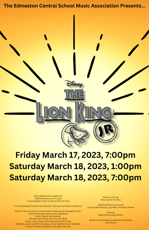 The ECS Music Association presents Disney's The Lion King Jr.! Students in grades 5-12 have been working hard and are ready to present this beloved Disney classic on the ECS stage on March 17th and 18th!