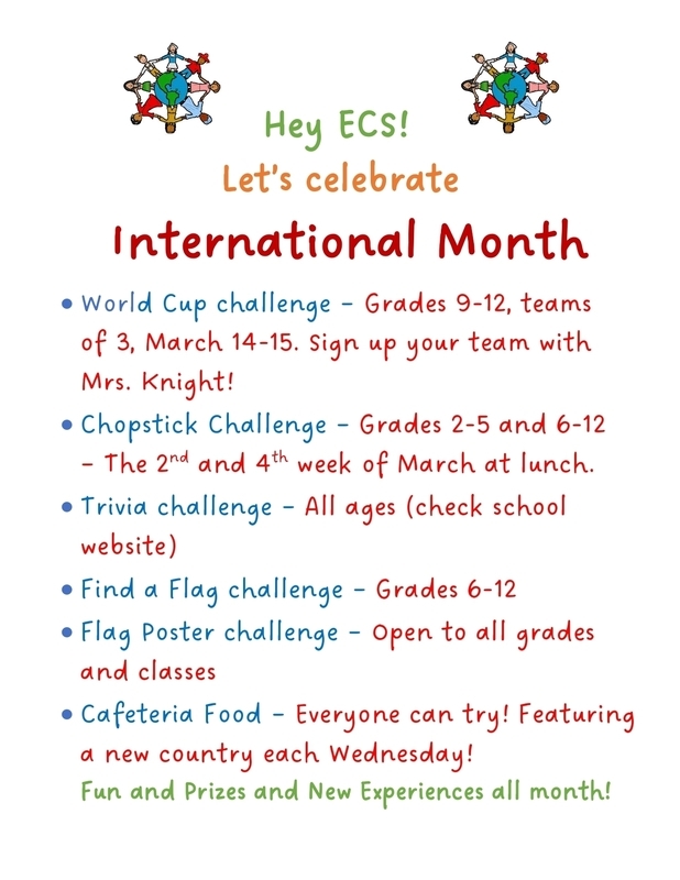 Celebrate International Month at ECS with activities all month long, plus try your hand at the International Trivia Challenge! Activities are sponsored by our ECS Spanish Club and students.